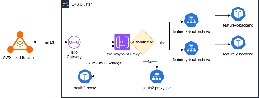 - Per-namespace Istio Waypoint proxies implementing L7 policy (HTTP routing, authz) in Ambient mode—without sidecars.