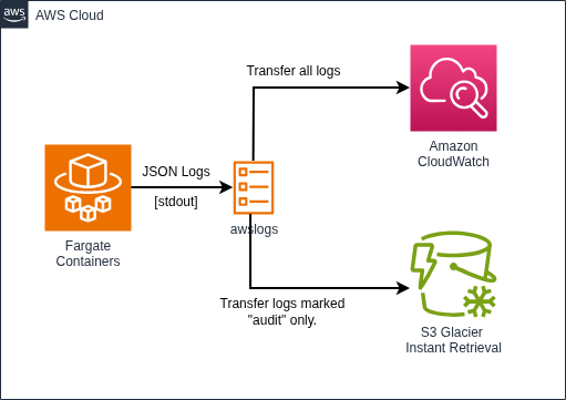 - Using the AWS awslogs driver, the destination is determined by examining the value of the category field in the output log. All logs are transferred to the AWS CloudWatch service, and audit logs are also stored in S3 Glacier storage.