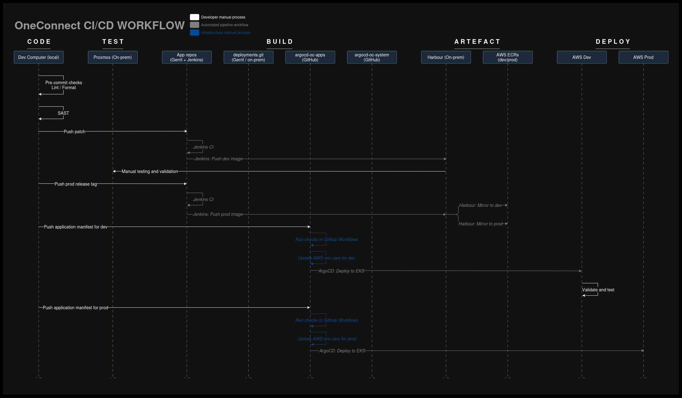 This is a document for how developers should be interacting with the OneConnect Infrastructure. This should serve as live documentation for the CI/CD workflow as it develops.